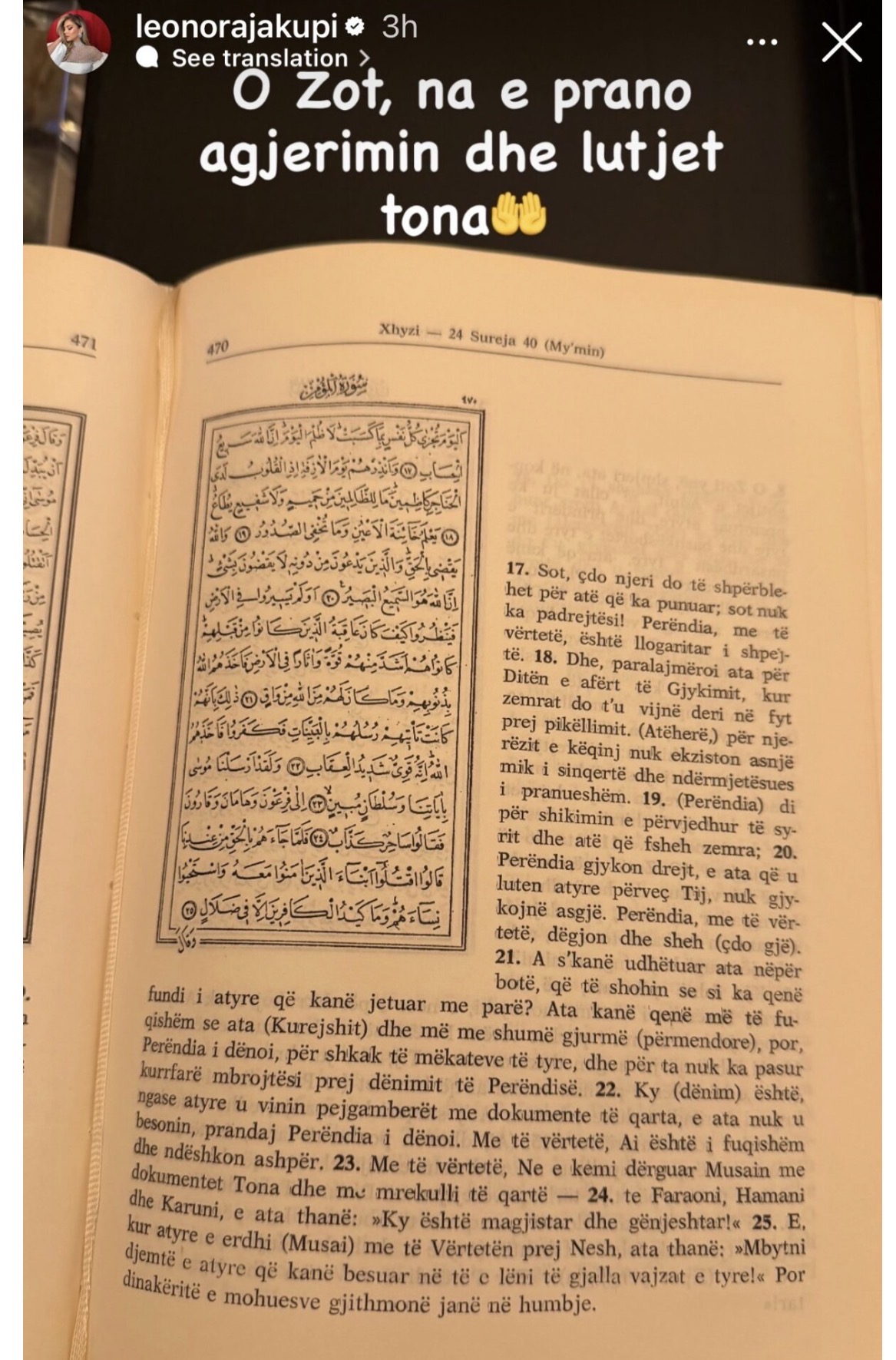 Në imazhin e publikuar shihet libri i shenjtë islam, Kurani, ndërsa Leonora ka bërë me dije se gjatë këtij muaji të shenjtë po i kushton kohë lutjes dhe reflektimit shpirtëror, shkruan IndeksOnline.