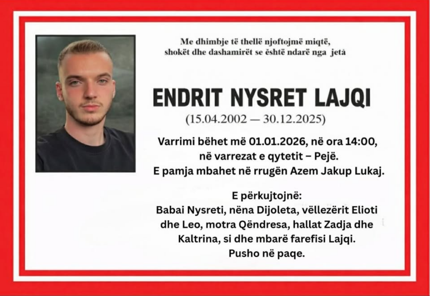 Njoftimin e kanë bërë familjarët e të ndjerit, të cilët kanë bërë të ditur se varrimi do të bëhet sot në orën 14:00 në varrezat e qytetit të Pejës.